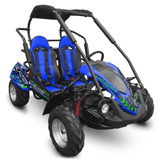The Blazer 200R off road buggy features a 4-stroke single cylinder air cooled engine, adjustable driver’s seat, parking brake, and light duty adjustable shock absorbers. This buggy is best suited to smoother trails and will handle gradients of up to 12 degrees. It is not designed or suited to doing jumps.